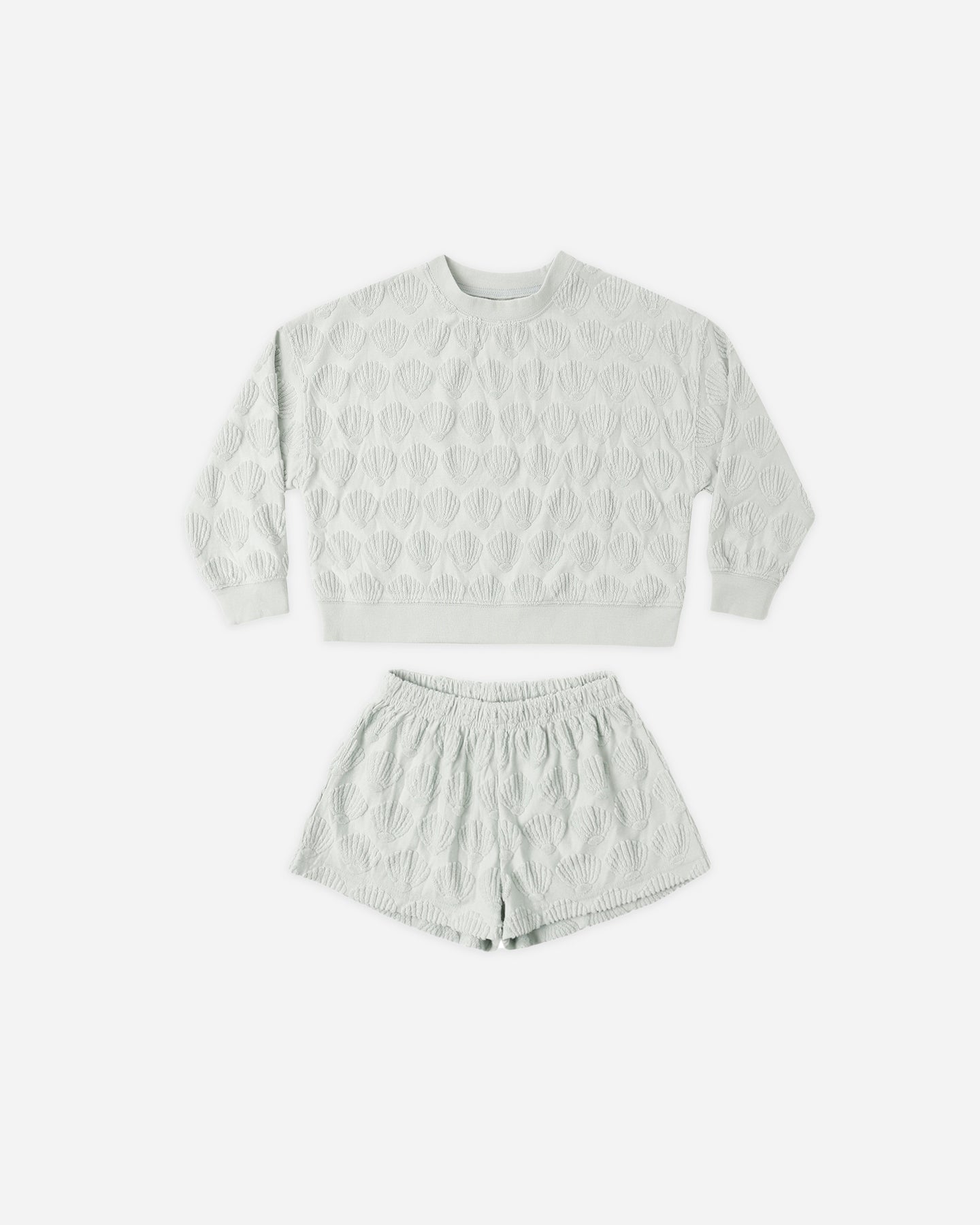 Light blue gray shell patterned sweatshirt and shorts set on a white background