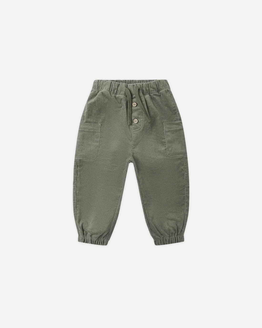 Comfortable corduroy pants with an elastic waistband and leg openings, adjustable drawstring, and side patch pockets.