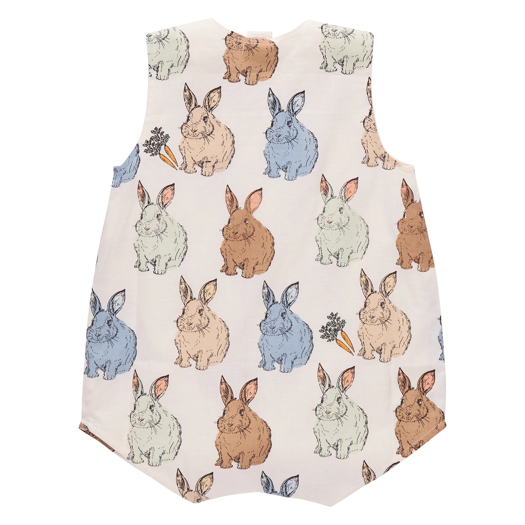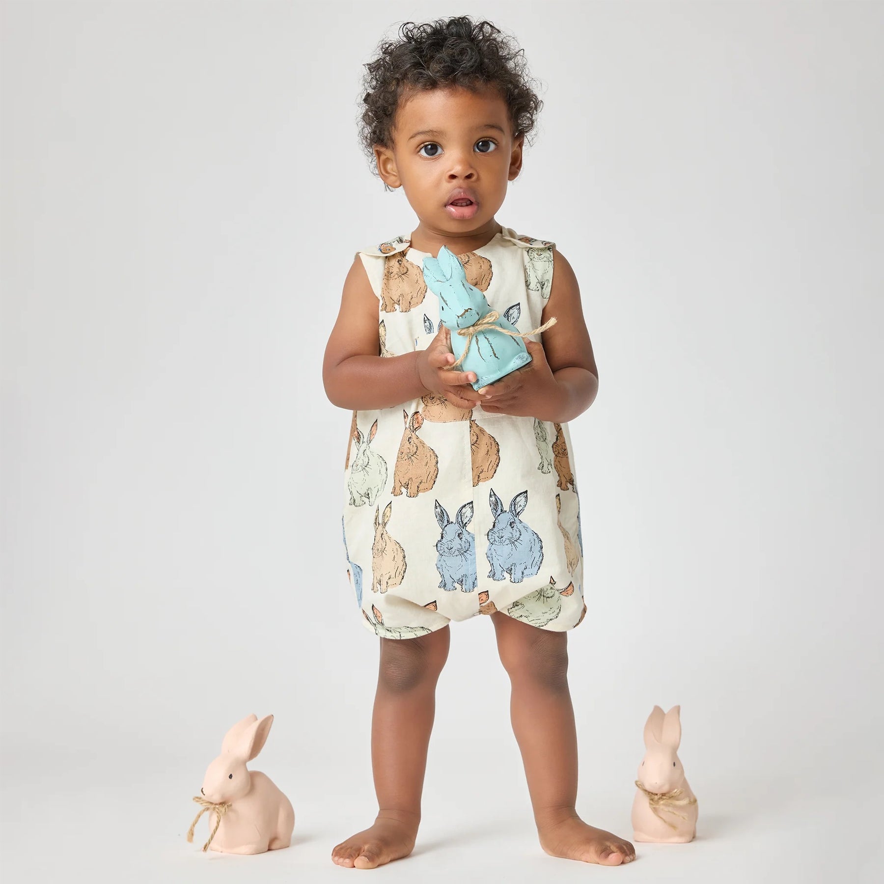 Blue vintage bunny print Wood buttons at the shoulder for easy dressing Front pocket centered at the chest One-piece silhouette Ring snap closure for easy diaper changes