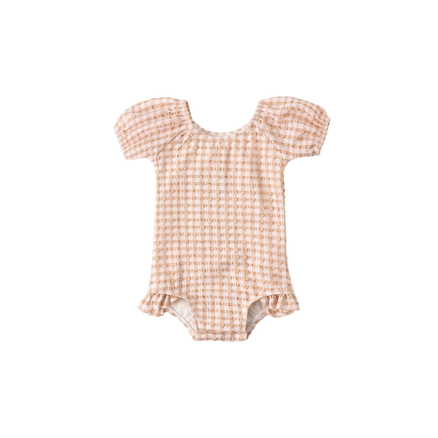 Regular price $37.00One-piece bathing suit with puff sleeves and ruffle detail at the leg openings.