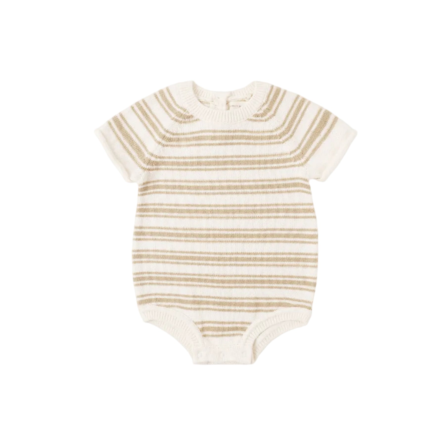 Regular price $50.00This sweet romper is the perfect knit look for warmer days. Designed with raglan sleeves with rolled hems, sweater ribbing on the neckline and leg openings, back buttons and bottom snaps for easy wear.