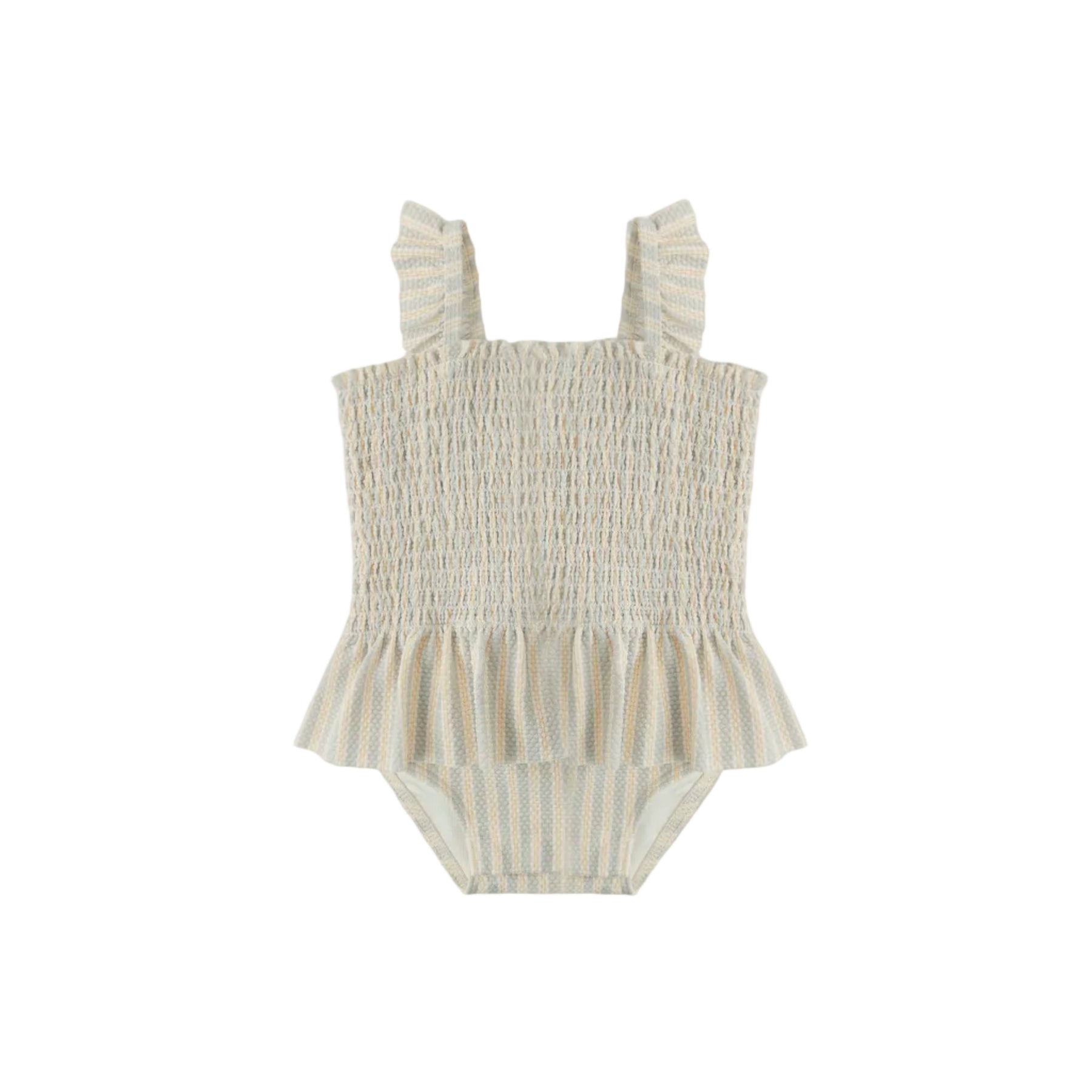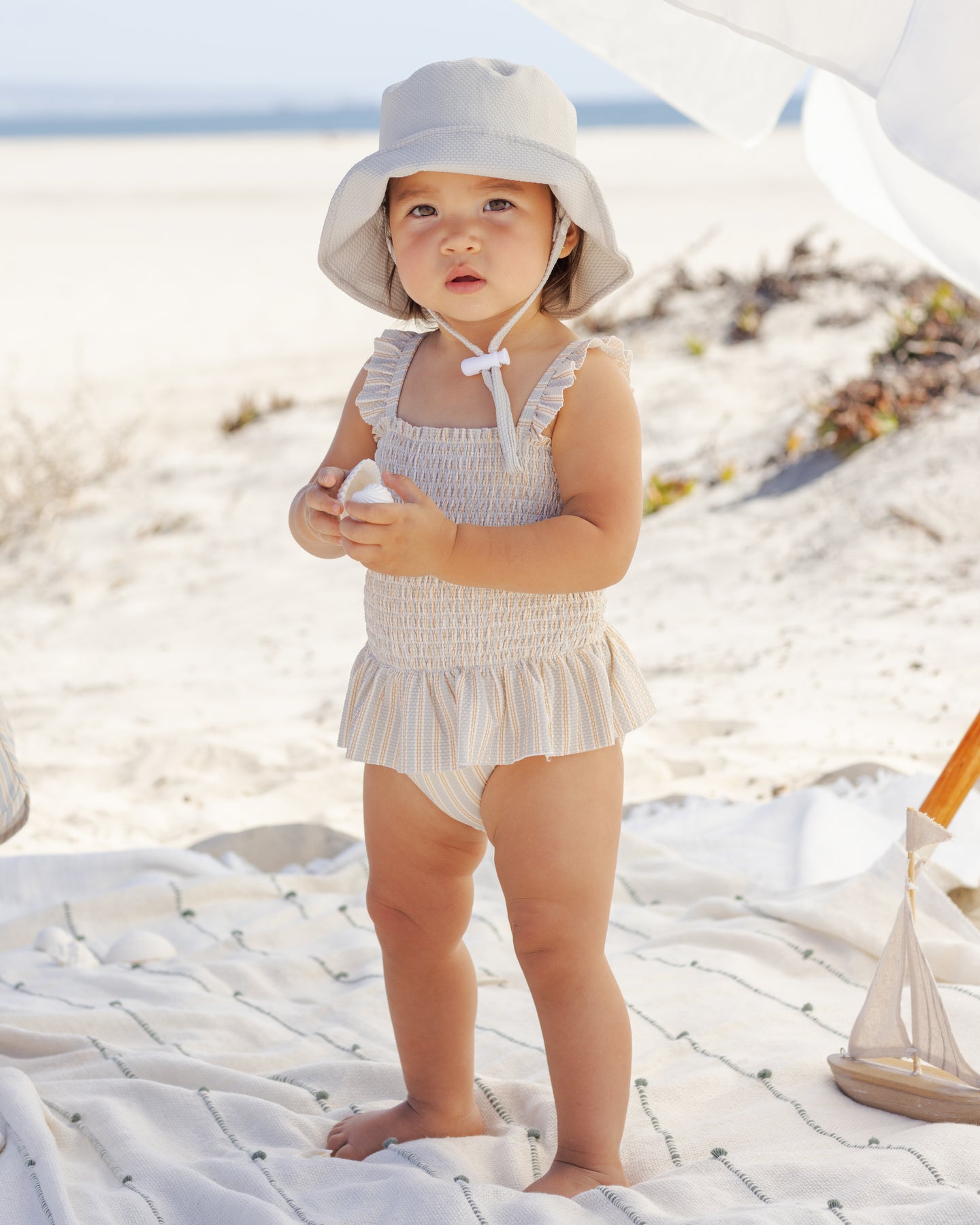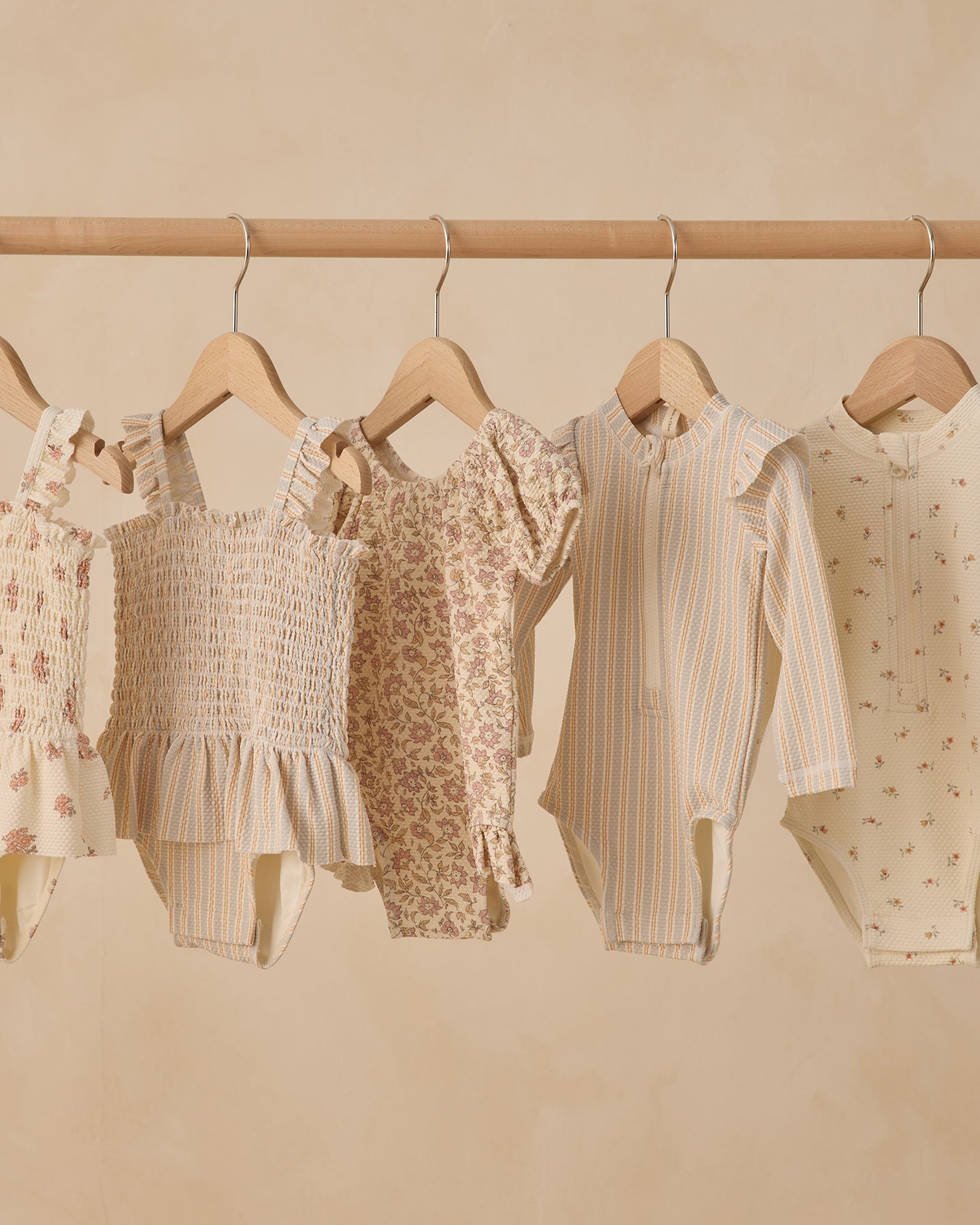 Our Quincy Mae Smocked One-Piece Swimsuit features a sweet smocked bodice, ruffle sleeves, and ruffle peplum skirt.