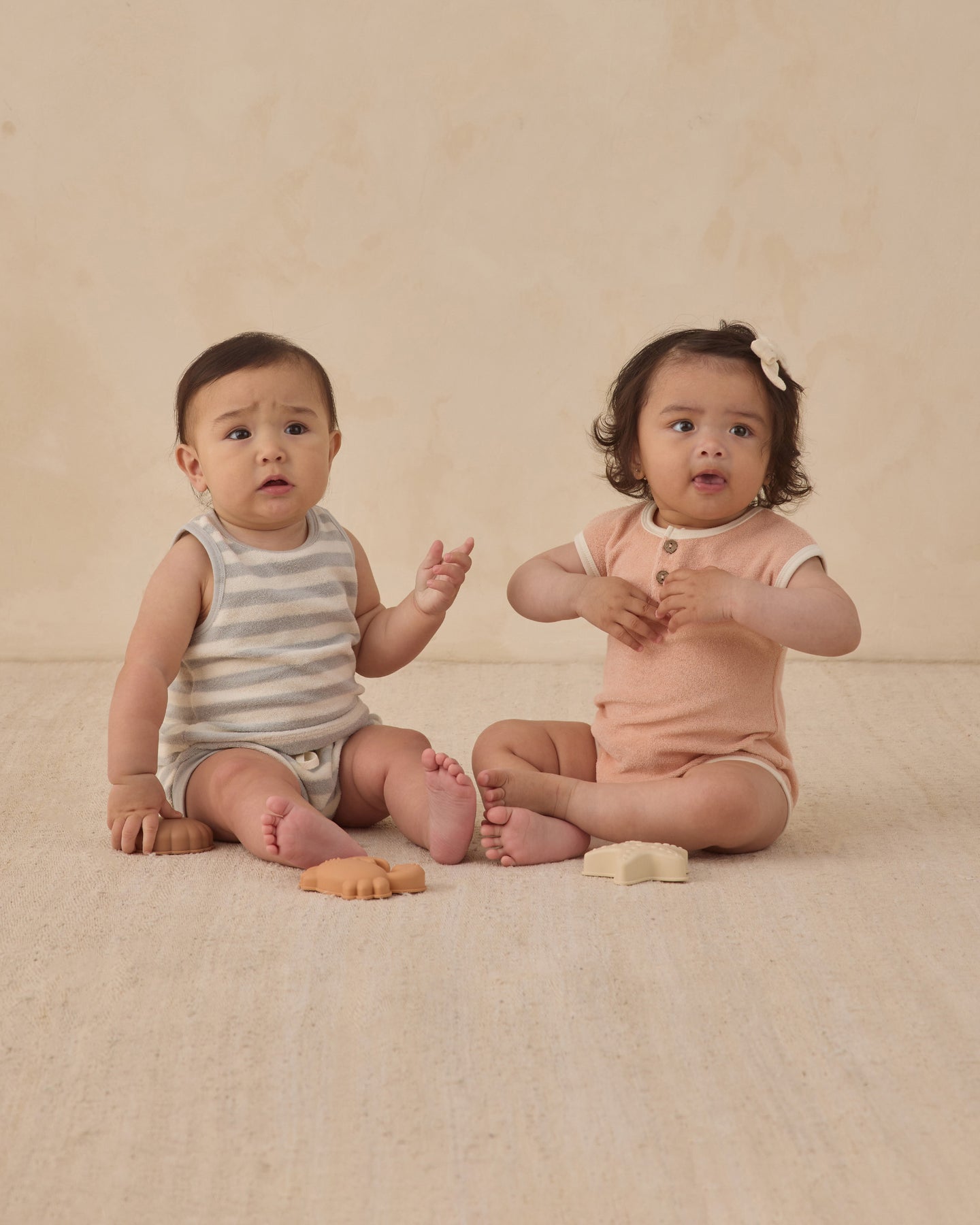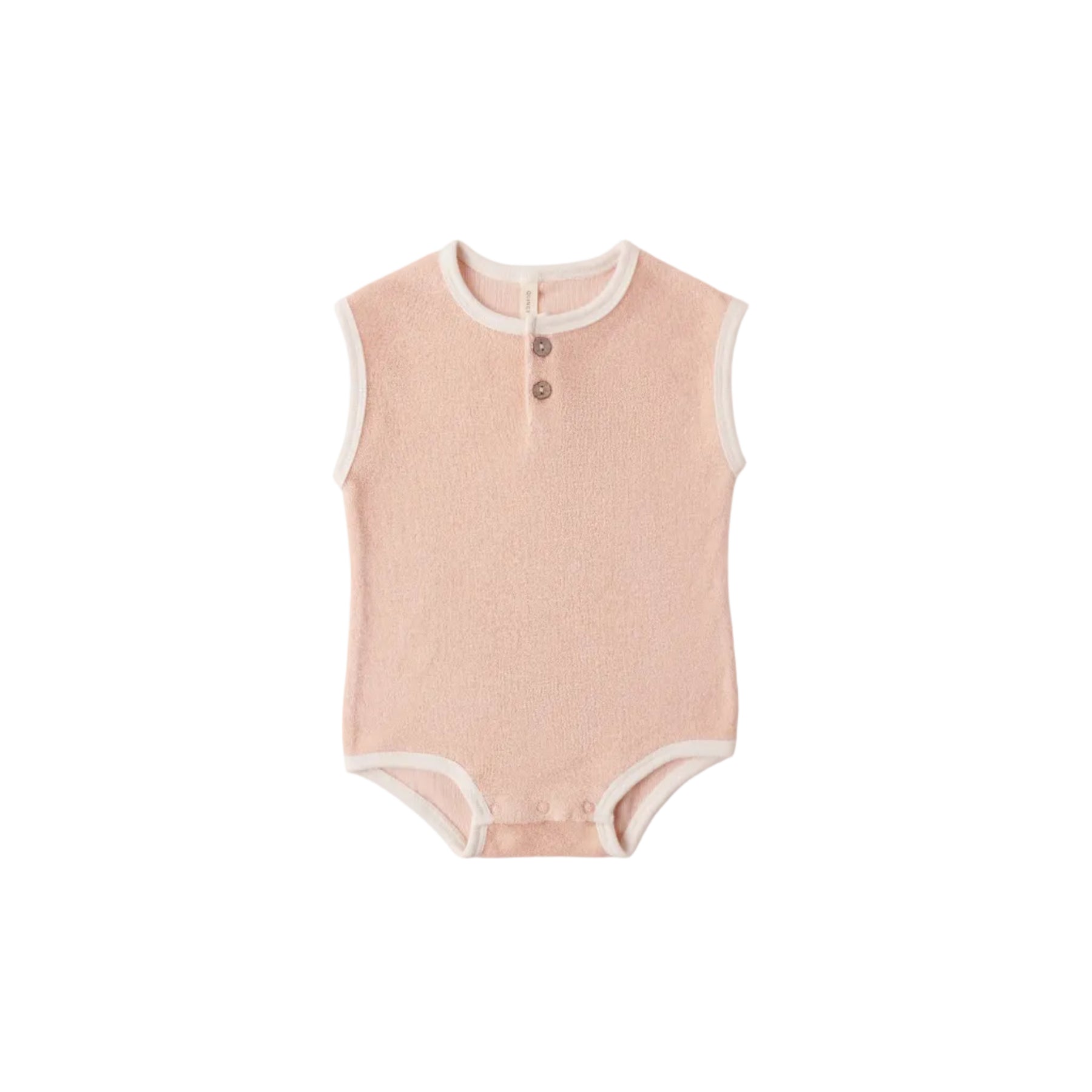 Regular price $33.00a Terry Cloth Romper features ivory contrast binding, front placket with coconut buttons, and bottom snaps for easy changing.