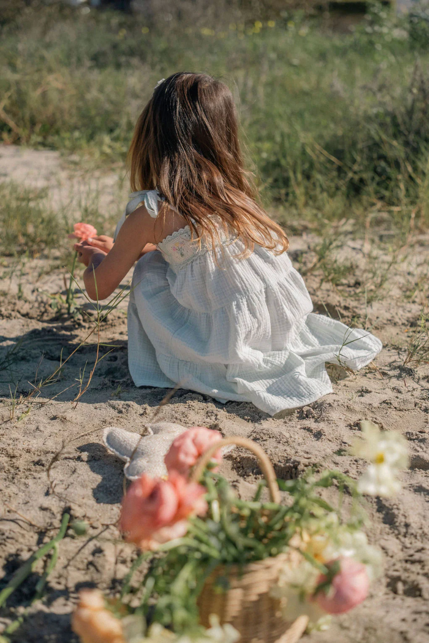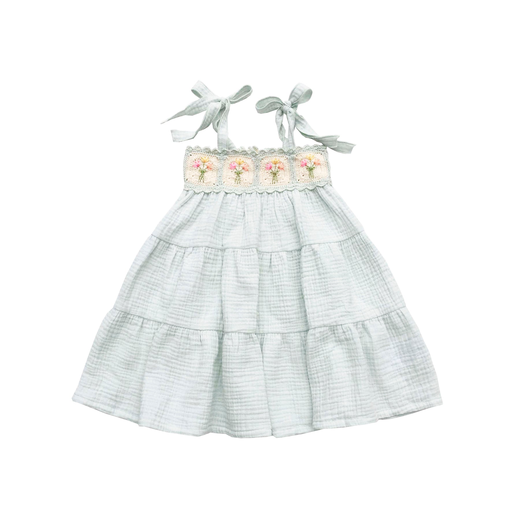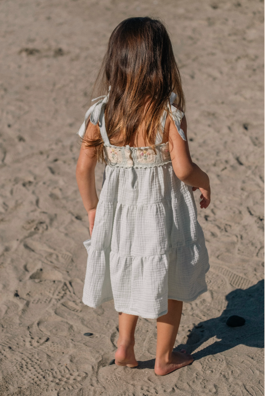 Adjustable shoulder tie straps grow with your child, while the soft, three-tiered skirt flows with every movement. Crafted in dreamy pastel seafoam with breathable 100% cotton gauze—perfect for spring celebrations, special moments, and everyday magic alike.
