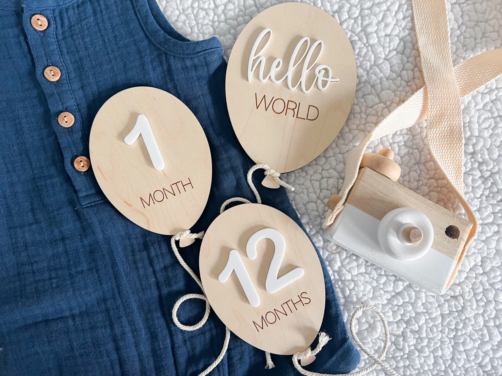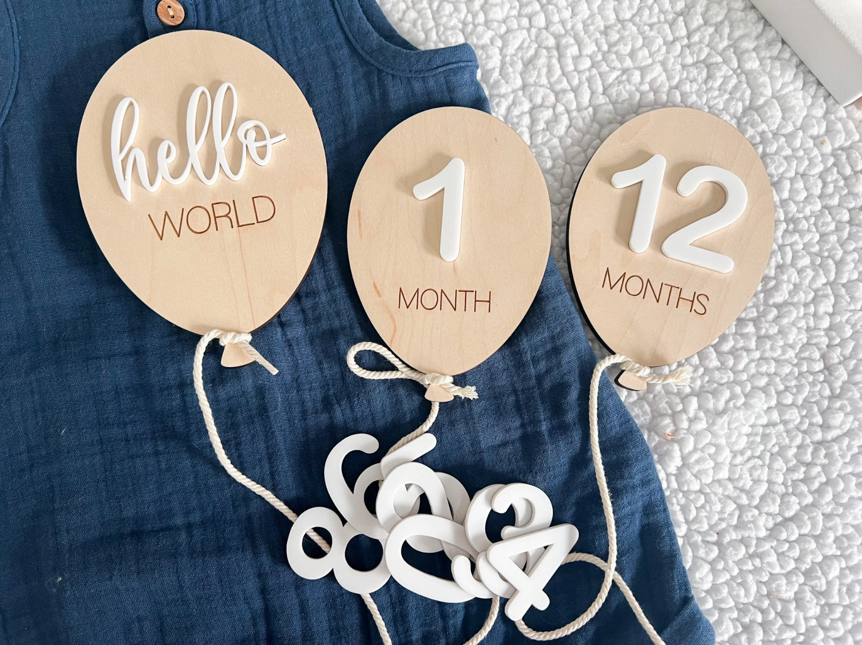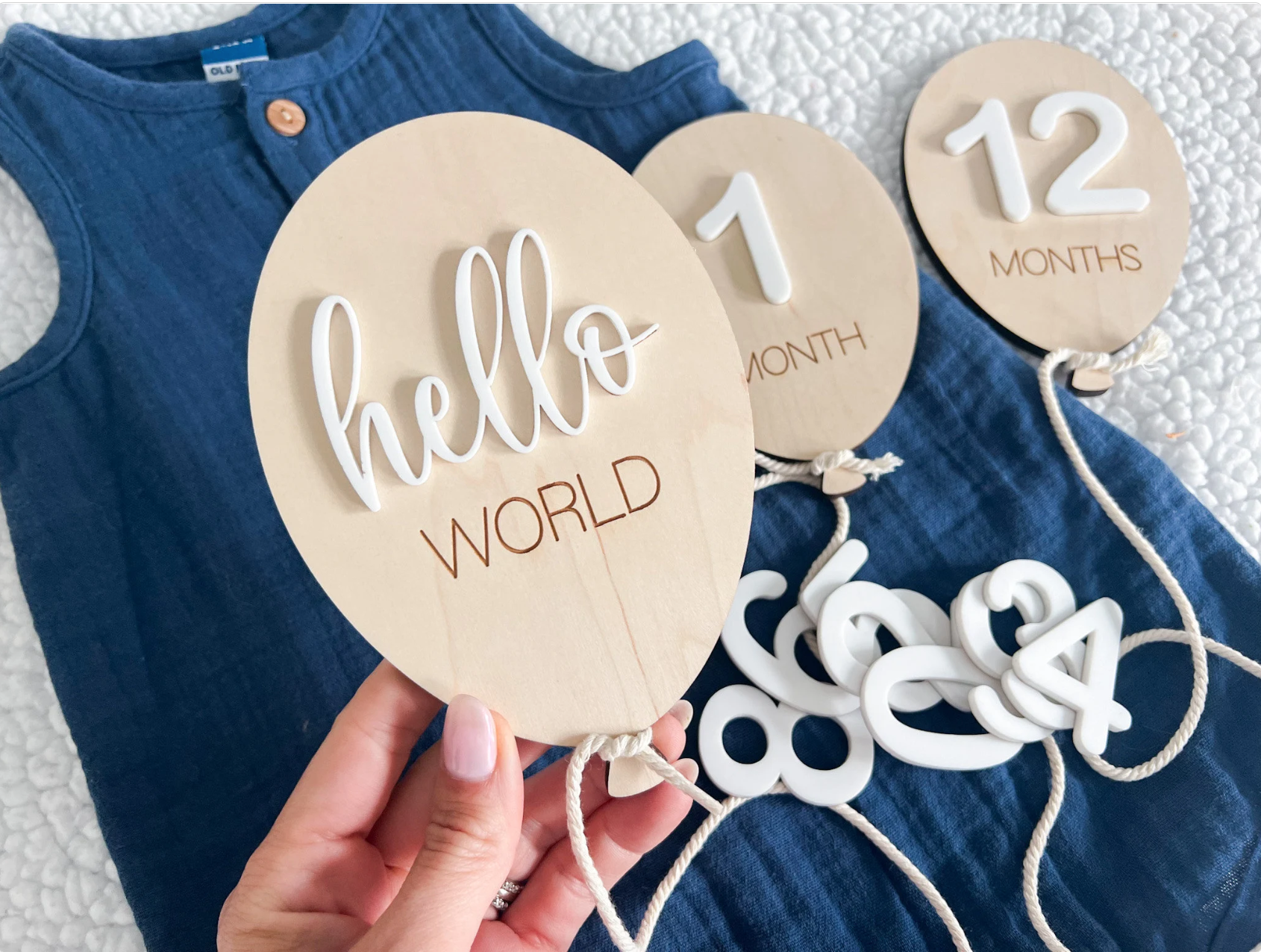 • Set includes 2 wooden balloon backings with string and numbers to complete 1-12 months (or beyond!), hello world balloon also included