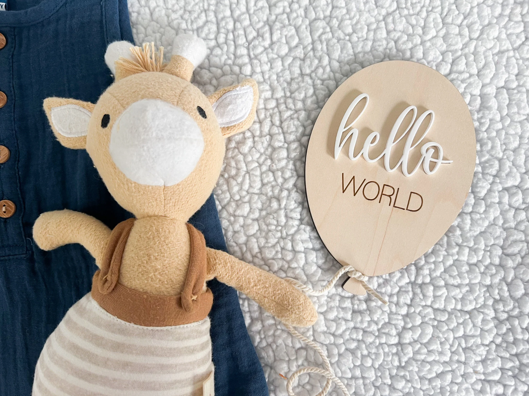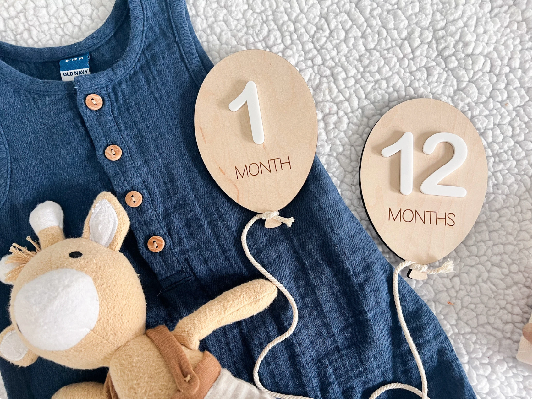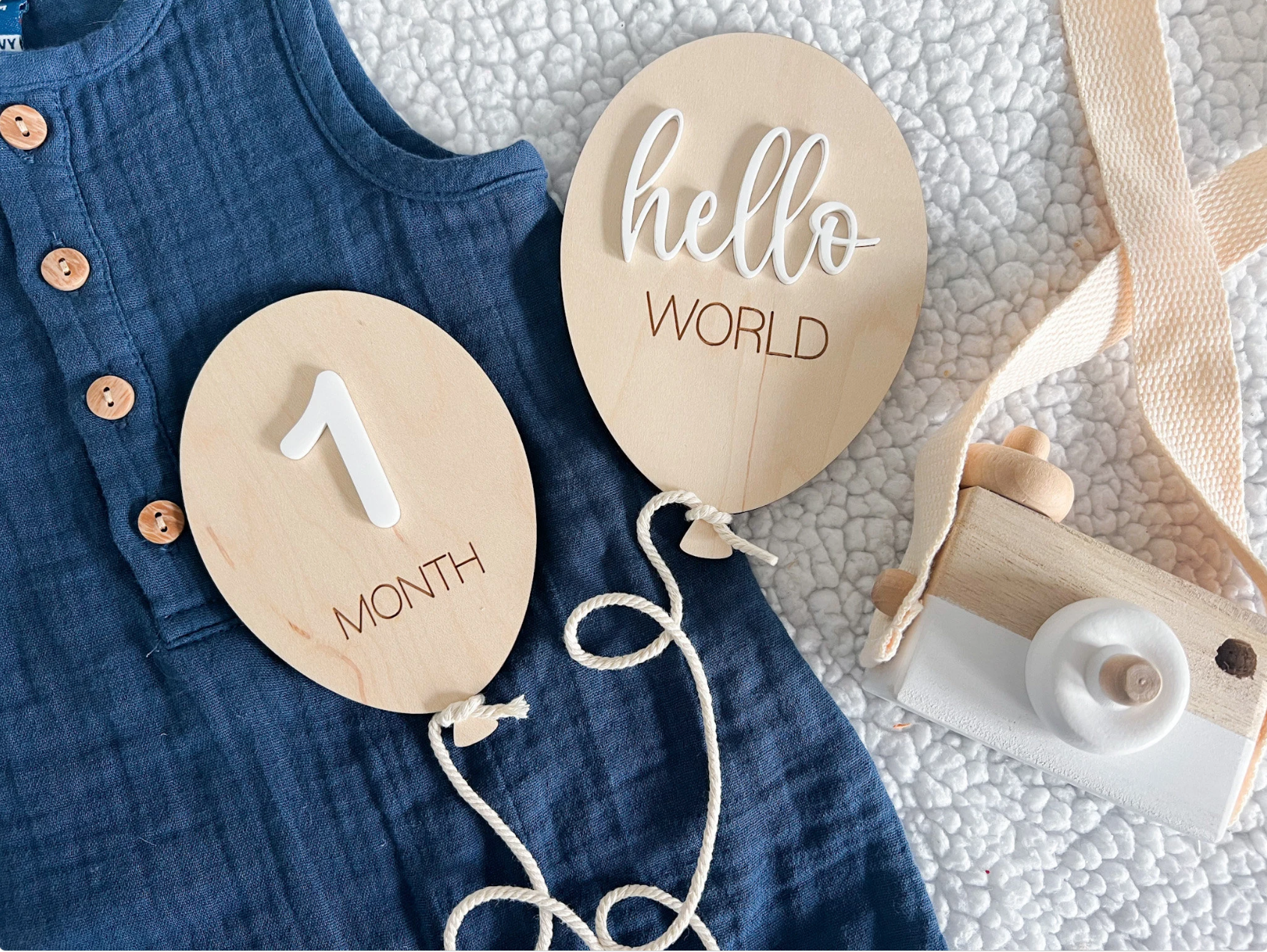 • Set includes 2 wooden balloon backings with string and numbers to complete 1-12 months (or beyond!), hello world balloon also included