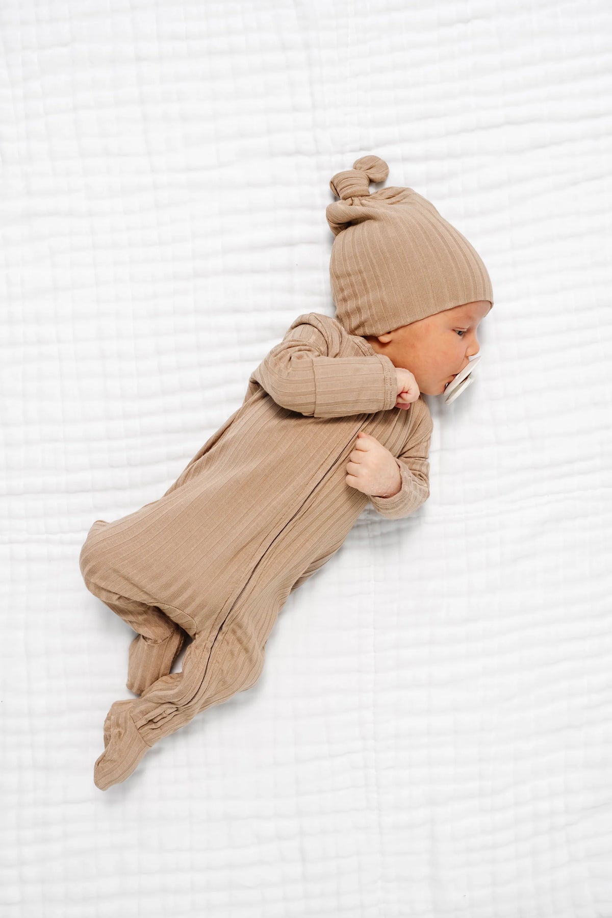 Brown baby onesie with a close-up of the fabric texture on a white background