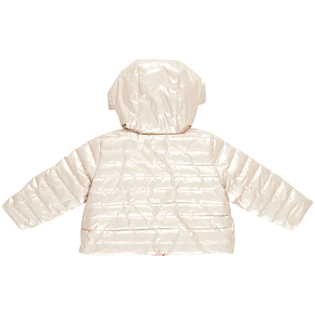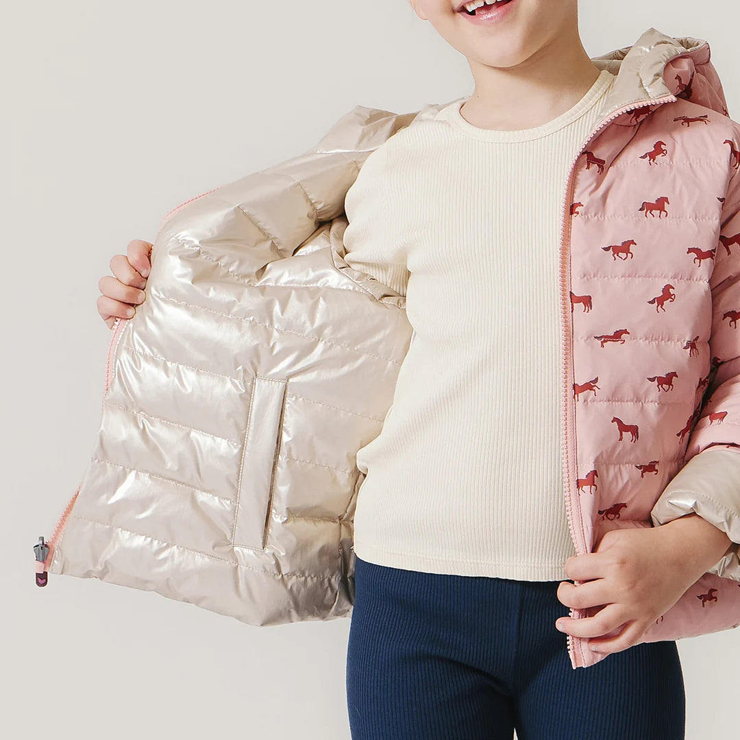 New Outerwear! Our new to the collection Girls Reversible Riley Jacket answers the call for versatile outerwear that can be dressed up and down to suit any occasion. Flash the classic printed side for school days and reverse to the metallic side for a fancy outing! This lightweight hooded puffer is water resistant and filled with premium duck down for warmth without weight. Designer details include generous side pockets on both sides as well as a sturdy front zipper with a colored pull tab.