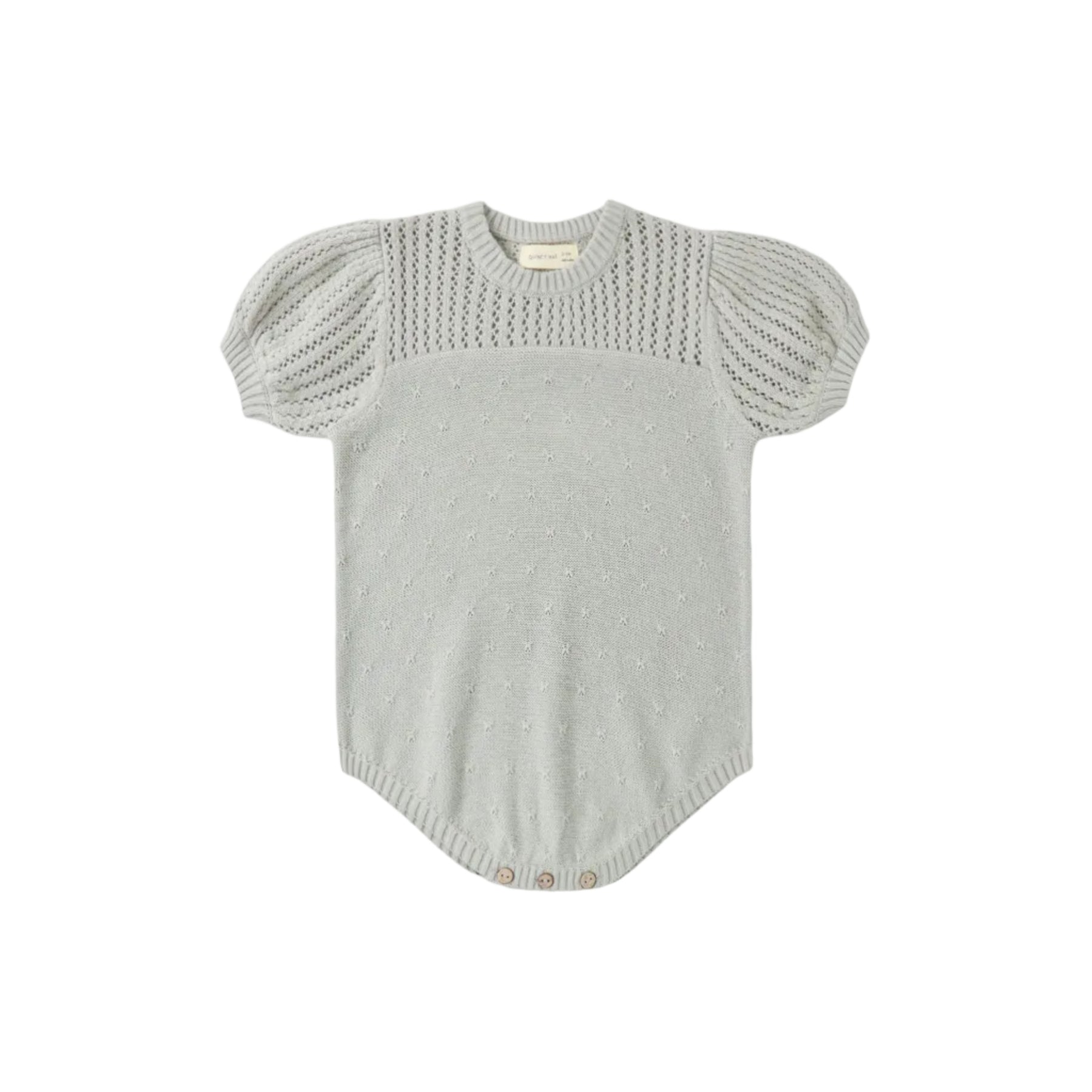 This sweet knit Quincy Mae romper features a pointelle knit pattern with pretty puff sleeves and coconut buttons at the bottom.