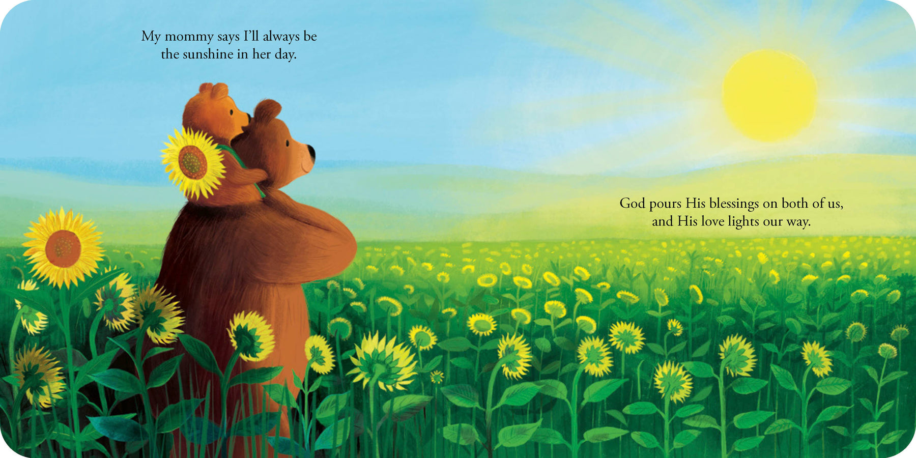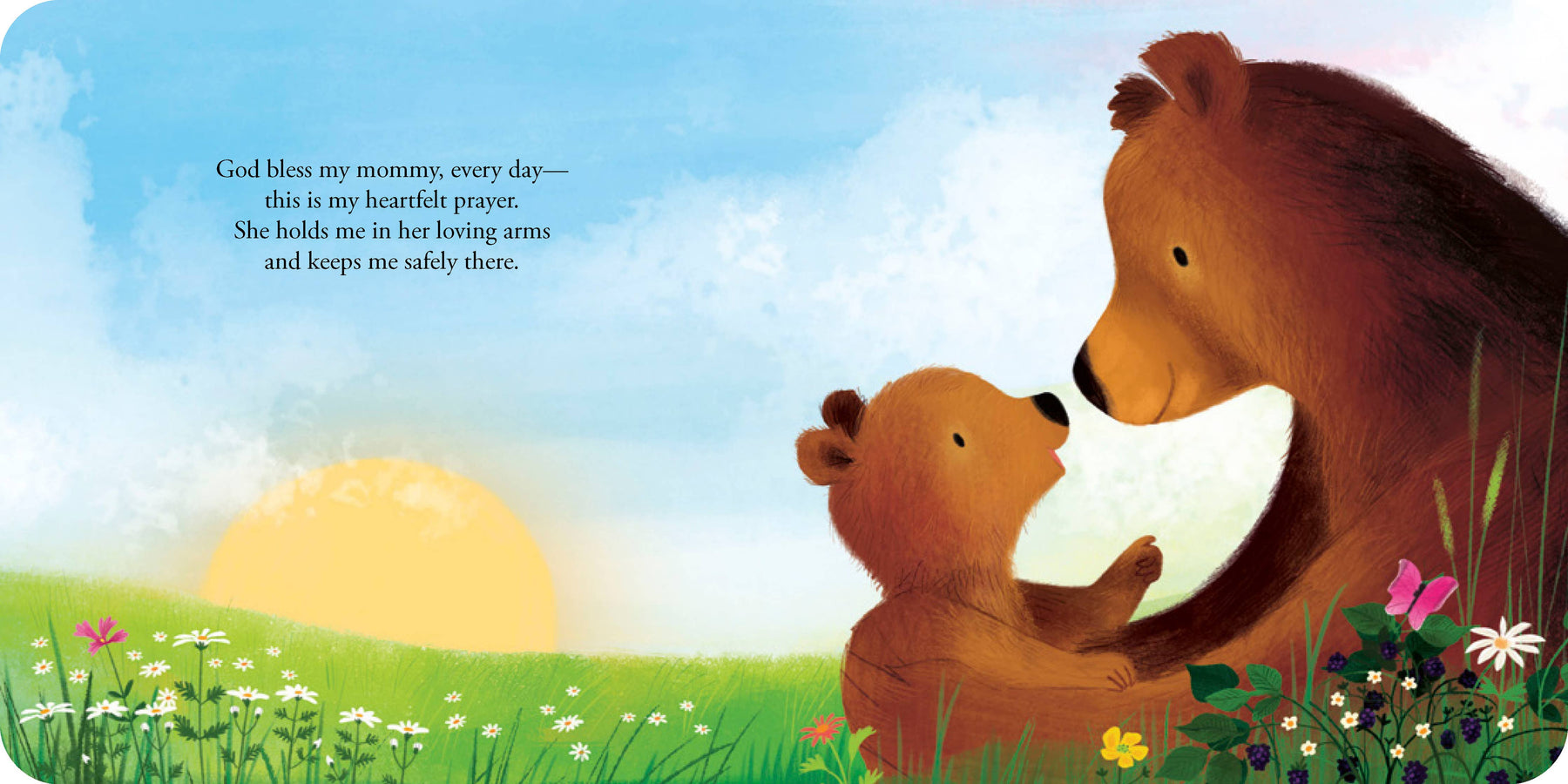 In this inspirational celebration of the love between a mother and her child, the baby bear calls upon God to bless Mommy every day. Mommy holds her baby bear close and offers protection with her strong arms. The two spend the day laughing and playing together, admiring the beautiful flowers in the field, and exploring new places. Mommy is always there to encourage her cub to be brave, and her cub sees how gentle and loving Mommy is to all those around her. The baby bear asks God for His protection for Mommy as she is the little bear’s guiding star. Includes a To/From page for gift-giving.