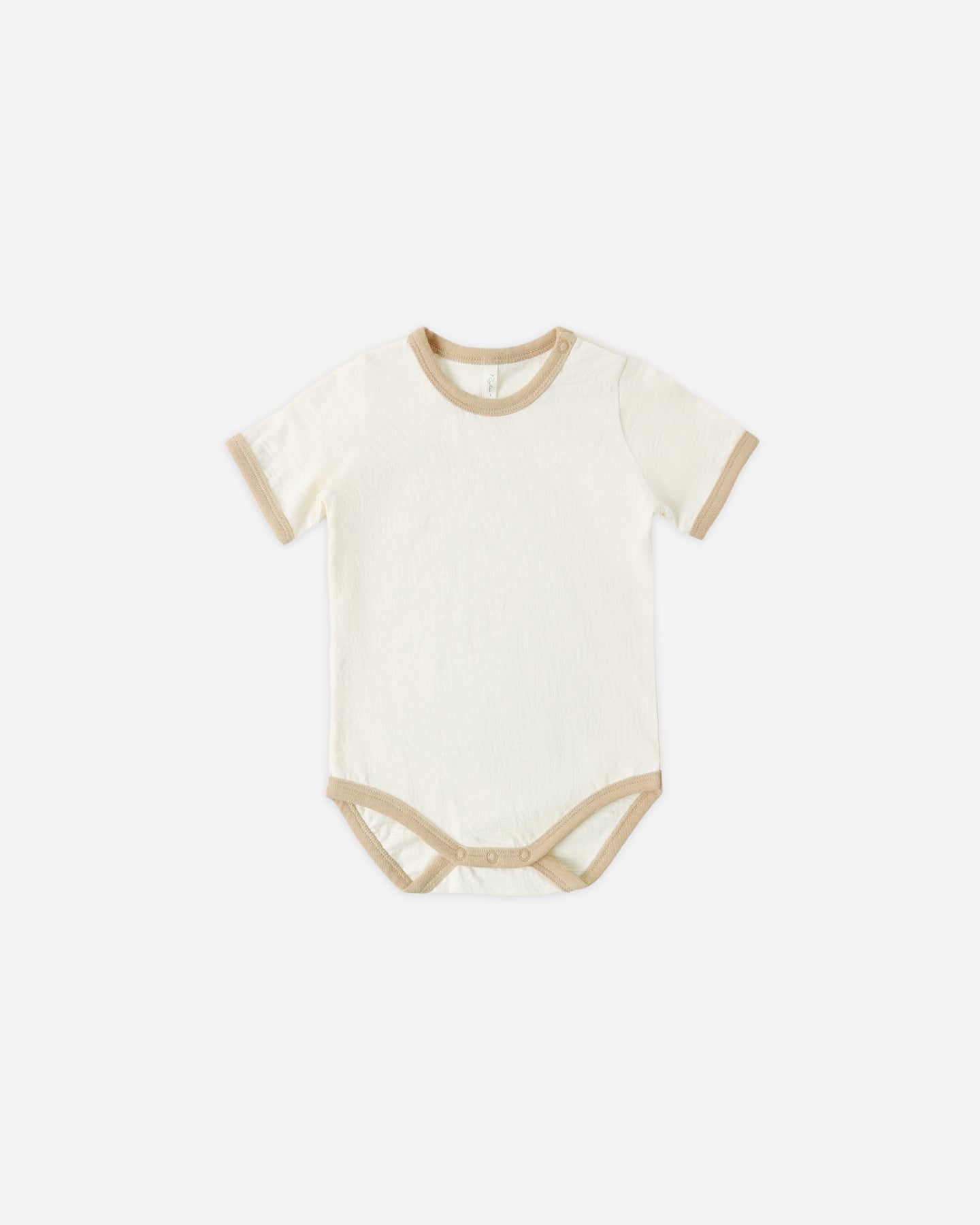 Short sleeved one piece in a velvety soft brushed jersey knit with contrast ribbing and snaps at the shoulder and bottom for easy changes.