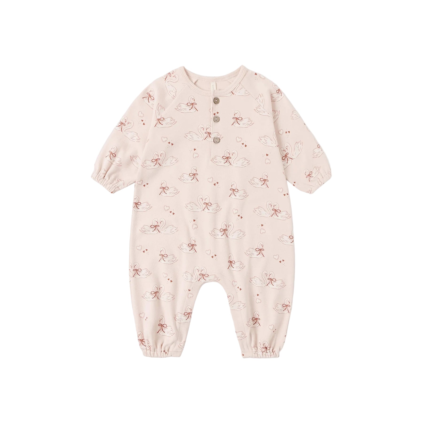 organic Quincy Mae Pink baby bubble jumpsuit with swan pattern