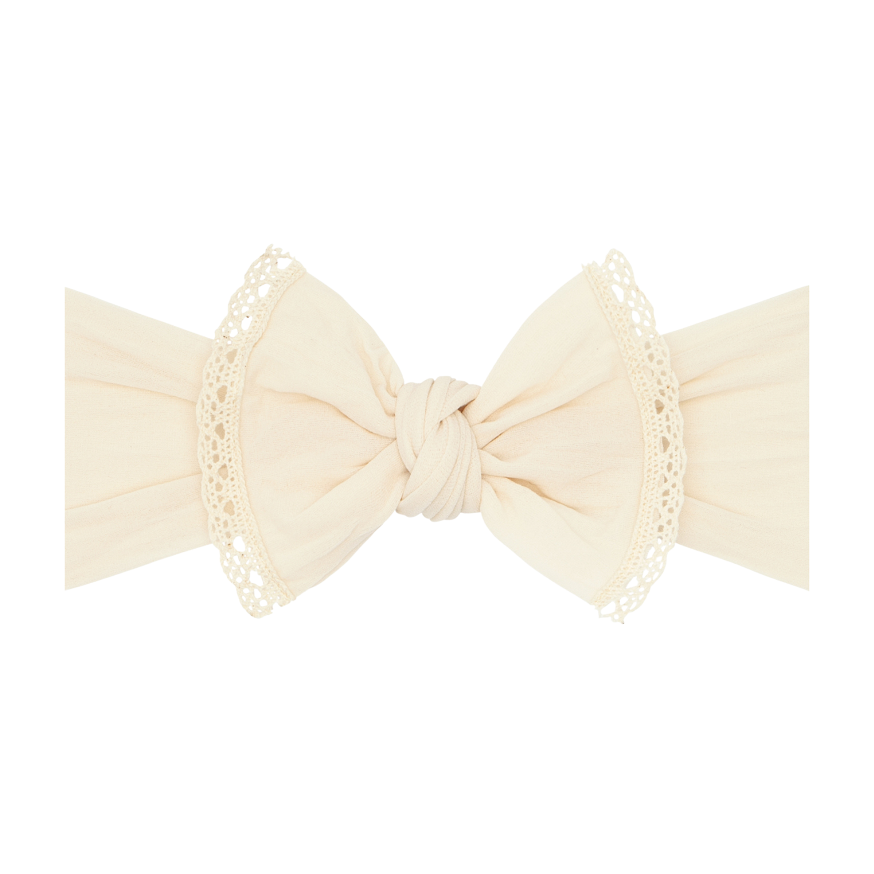 A little trim never hurt anybody! The Trimmed Knot is your favorite Classic Knot headband with the added pom-pom or lace trim detail for the perfect finishing touch. This headband is one size fits most and the size cannot be adjusted. The headband is sewn at a 6" diameter (12" circumference), keep in mind that measurement is before it stretches. We feel this is the perfect size for our soft nylon to fit a newborn and stretch comfortably as she grows through childhood. The bow measures approximately 4.5" across. The trim is securely sewn to the edge of the bow. This style is sewn in two pieces and can be taken apart for hand washing or to mix-and-match. The Trimmed Classic Knot material is soft nylon, produced to our specifications, in the USA . The pom-pom trim is polyester and the lace is poly/cotton, both sourced in the US. Each headband is hand sewn and tied by women in our local community. Due to the nature of small-batch production color and sizing can vary slightly.