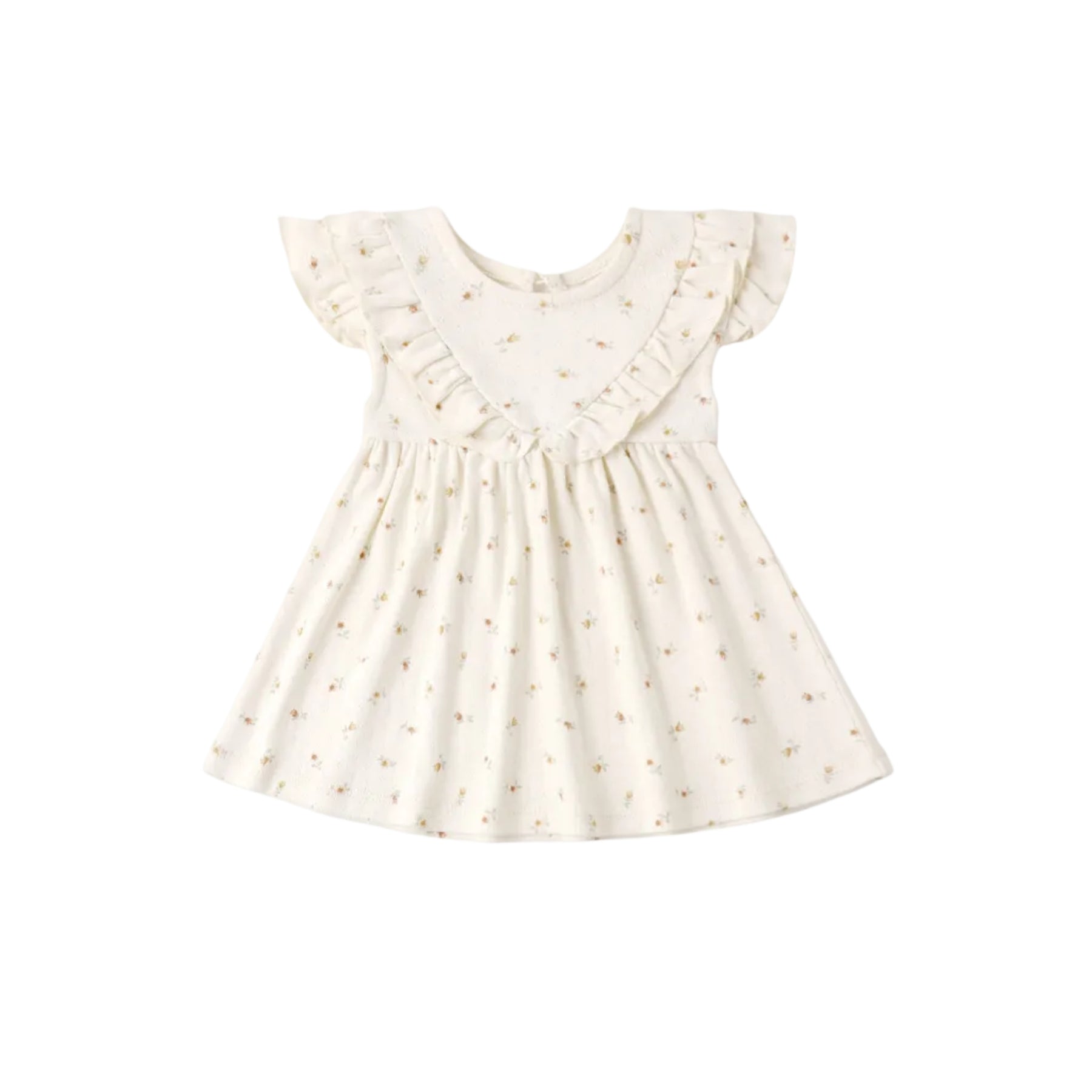 Flutter sleeve dress with sweet ruffle detail in a classic pointelle fabric. Button back closure for easy changing. Coordinating bloomers included with all sizes.