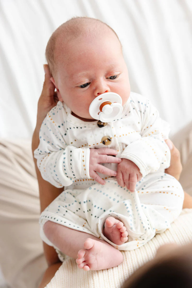 The easiest tie-bottom outfit for day or night. Made for hassle free diaper changes and gentle dressing, I designed this with a button-down front and tie bottom for simple closure (no more snaps at 2am!). Fold over wrist cuffs are the most thoughtful finishing touch.