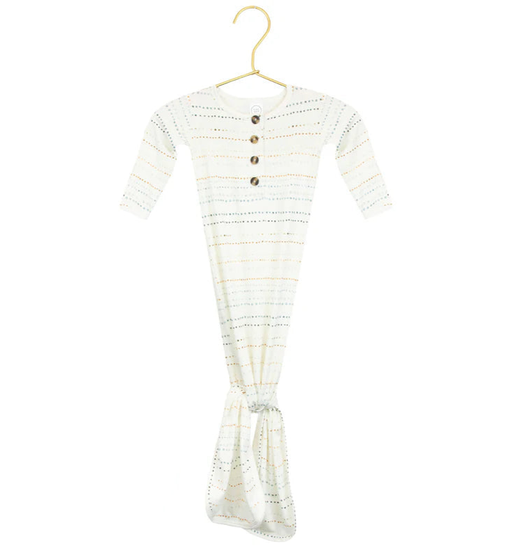 A knotted gown for babies with long sleeves, featuring rainbow dots pattern and button-down front, displayed on a hanger.