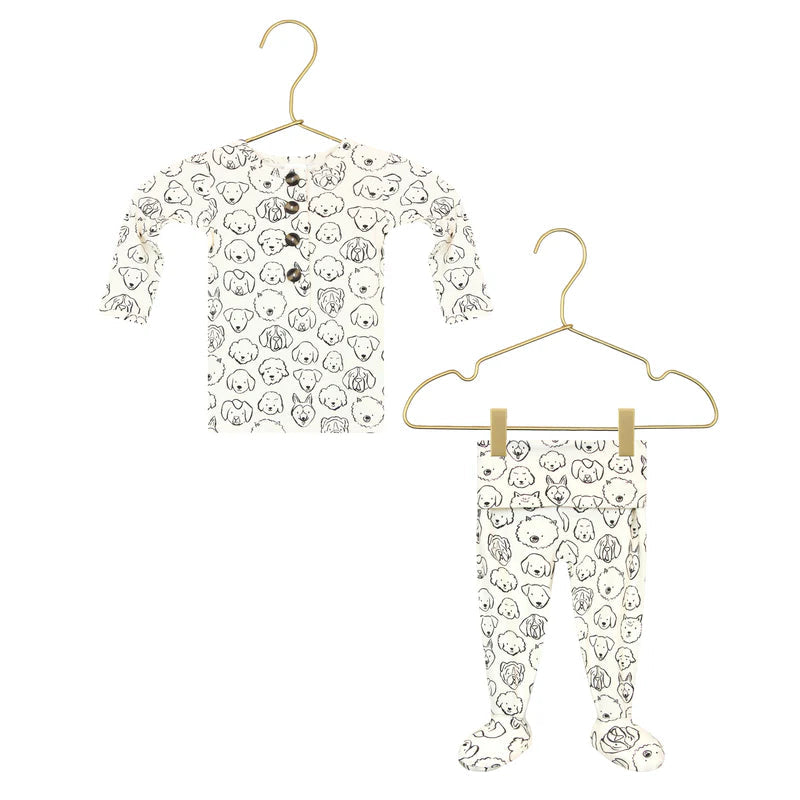 Outfit set for infants featuring a top and bottoms with a dog pattern, displayed on hangers.