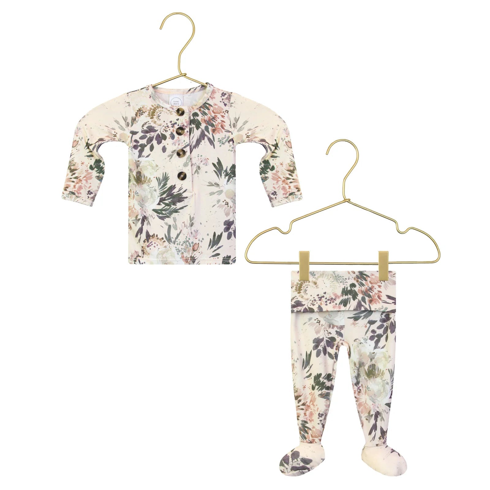 Floral-patterned baby outfit with shirt and leggings on hangers against a white background.