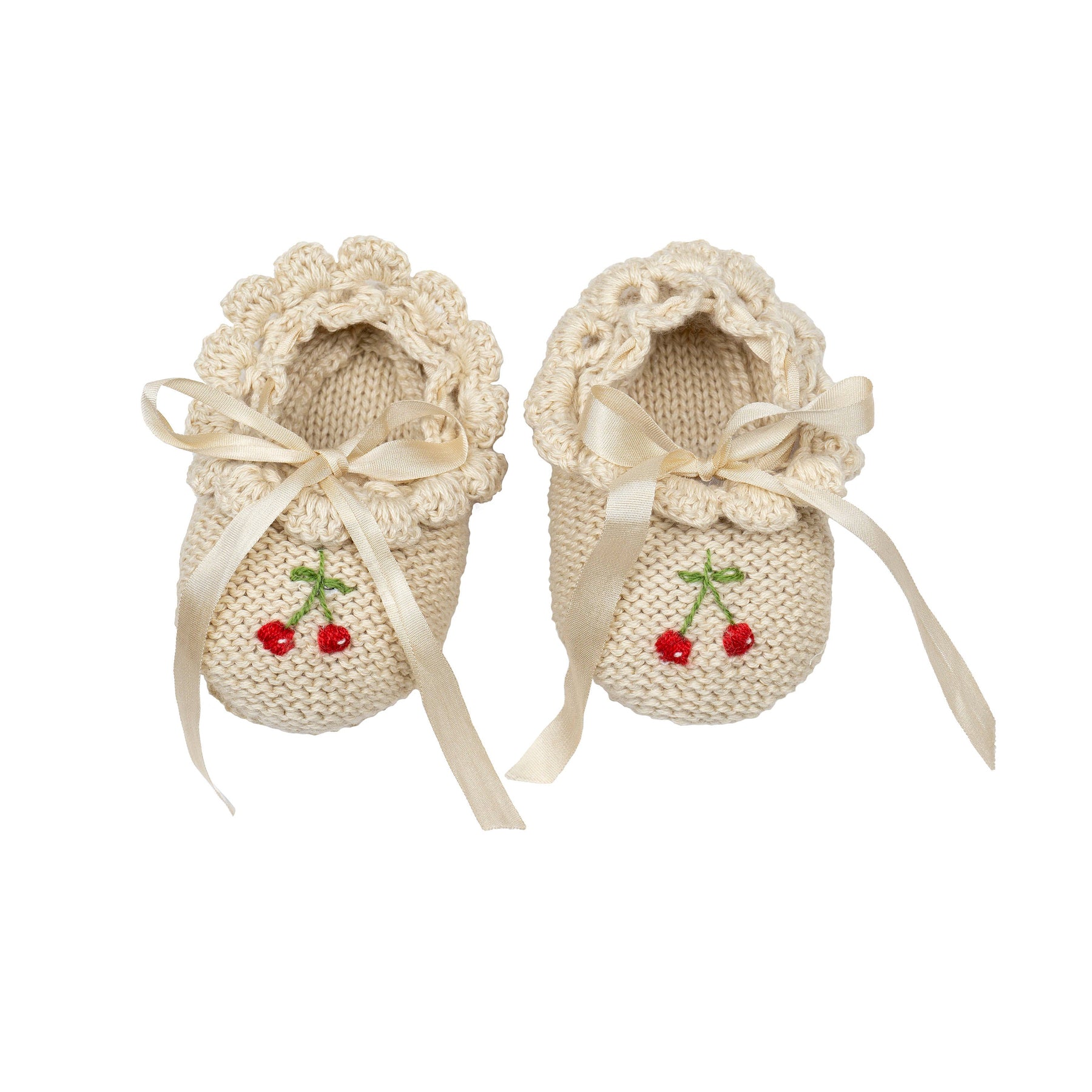 Pair of knitted baby shoes with ribbons and cherry details on a white background