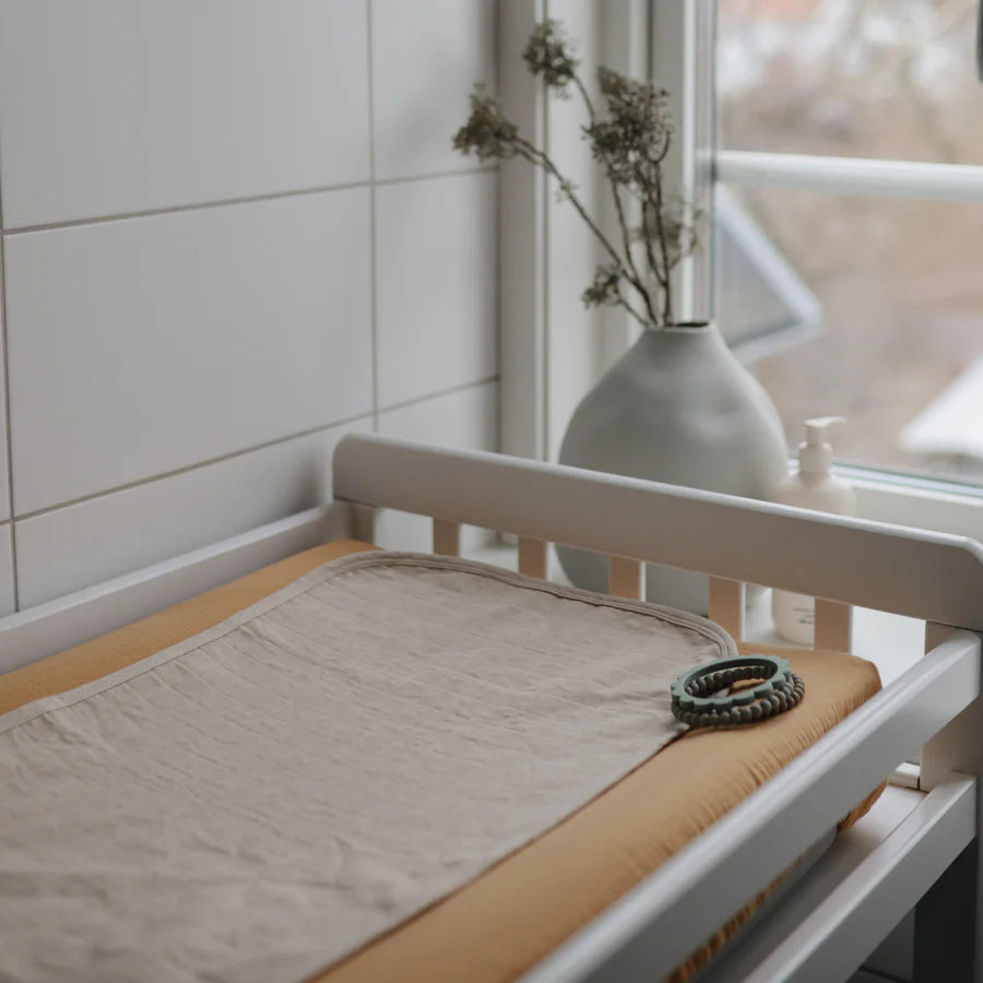 Help keep your baby’s space clean and add a layer of calming comfort to diaper changes with Mushie muslin changing pad liners. Crafted with 100% organic cotton on the top and a soft bamboo blend on the bottom. A water repellent layer helps prevent messes and prolongs time in between changing pad washes. Designed with busy parents in mind, our liners are machine washable, protect most standard size changing pads and easily fit into a diaper bag for on-the-go changes.