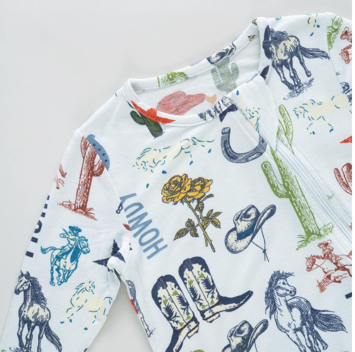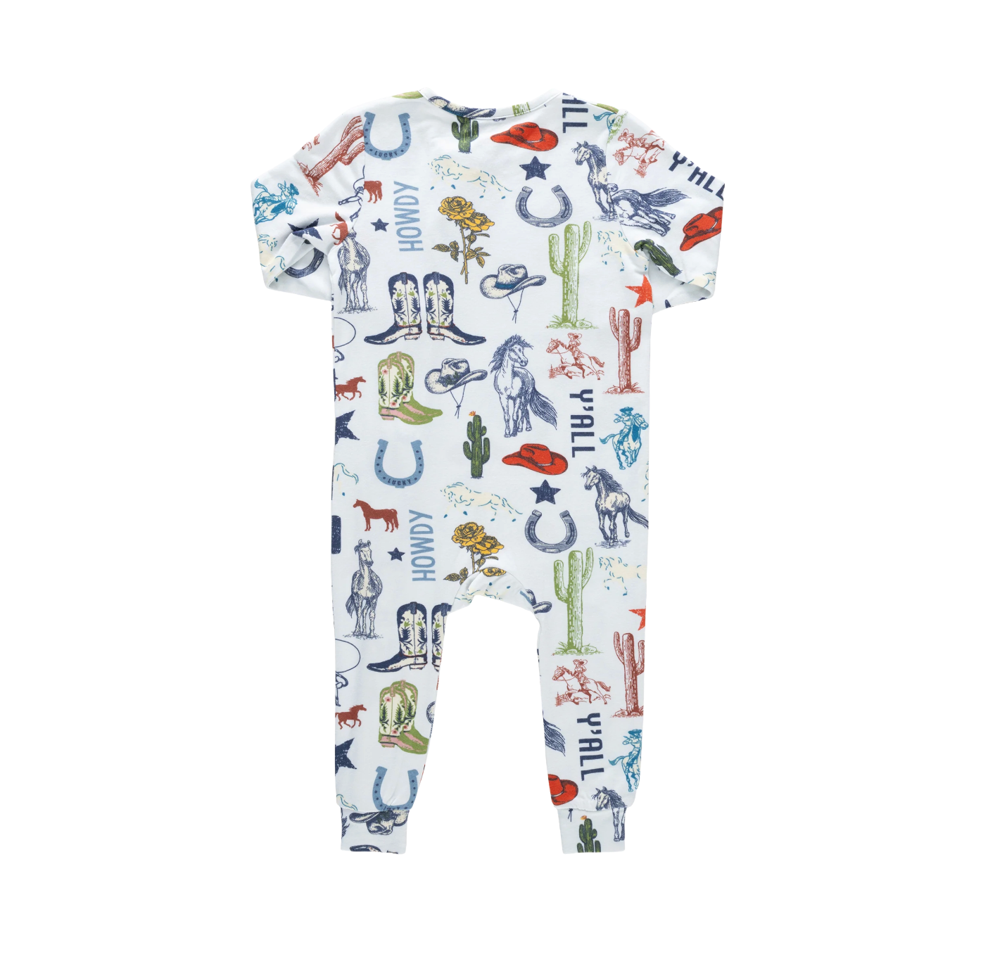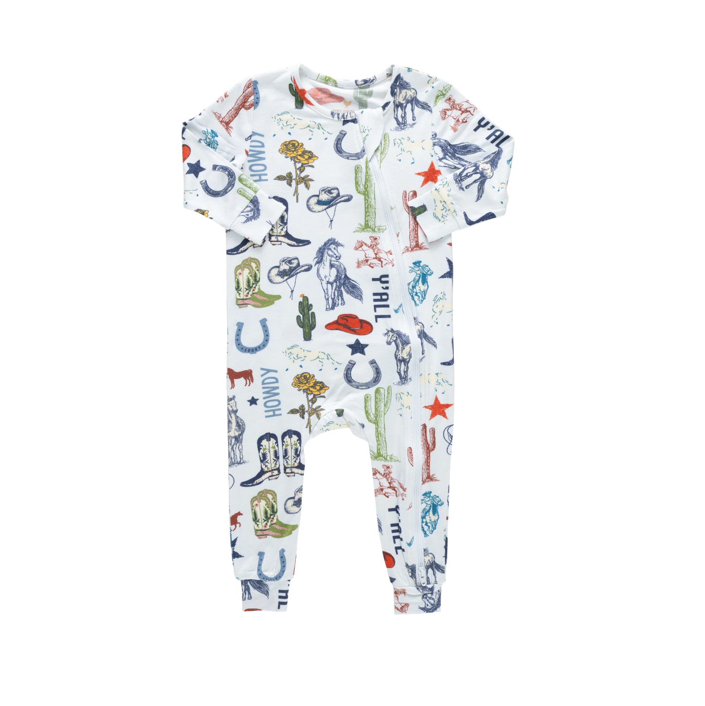Saddle up for soft snuggles! Our Baby Bamboo Romper features our playful Western Dreams print, filled with charming cowboy-inspired icons for a little western whimsy. Designed with everyday ease in mind, sizes 0/3m and 3/6m include fold-over hand and foot cuffs for extra coziness, while a two-way zipper with a protective cover makes diaper changes quick and stress-free. Made from ultra-soft bamboo fabric with a smooth, silk-like feel, this breathable romper keeps littles cool in warm weather and comfy all year long.