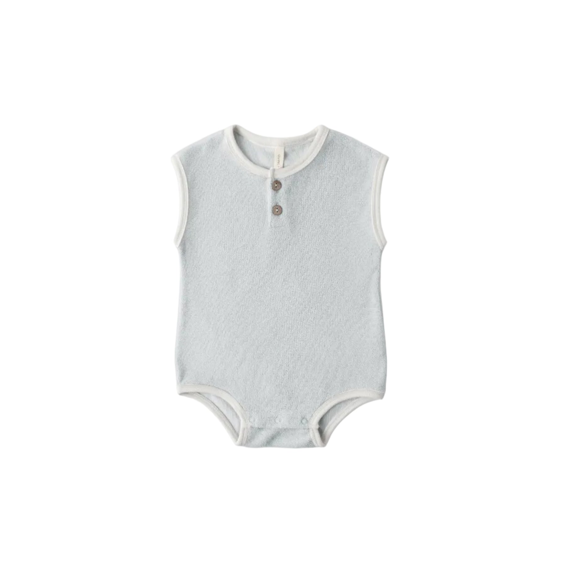 Regular price $33.00This Quincy Mae Terry Cloth Romper features ivory contrast binding, front placket with coconut buttons, and bottom snaps for easy changing.