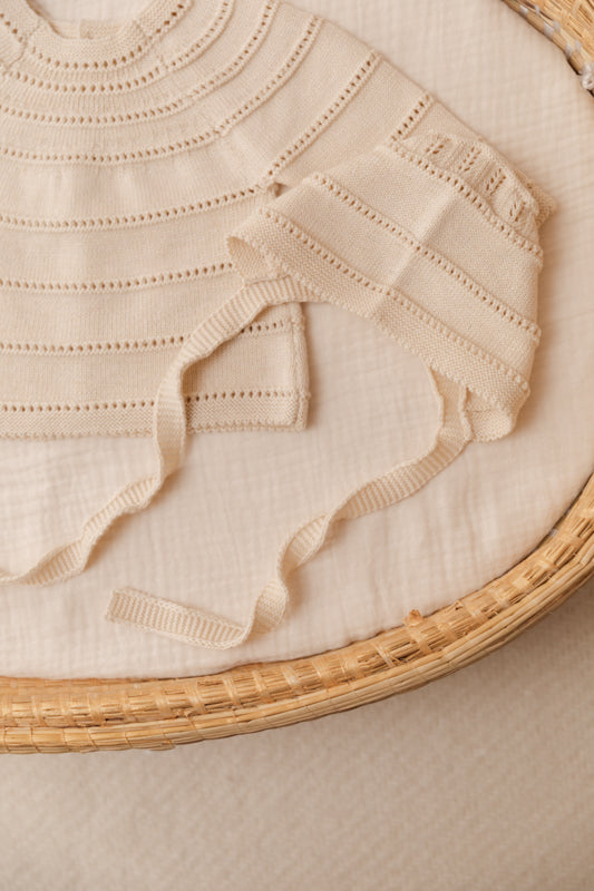 Welcome Baby Knitted Set in Ivory is a sweet, statement-making piece with an elevated feel—perfect for special moments and everyday photos.