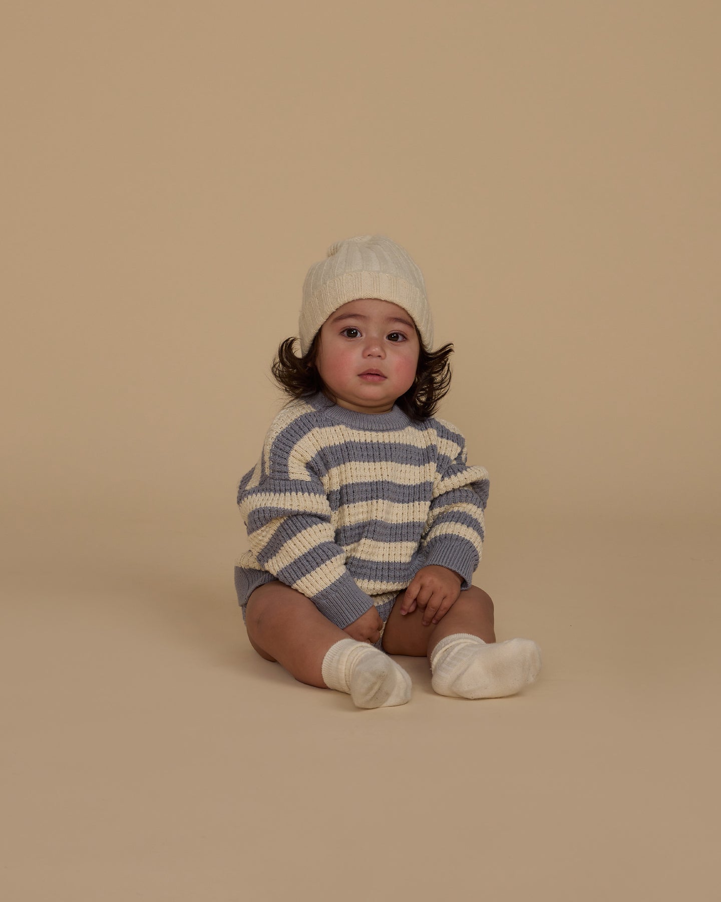 This Rylee + Cru knit bloomer is made of the softest dusty blue stripe sweater knit on natural. Finished with a ribbed waistband and leg openings. Paired perfectly with our Aspen Sweater.
