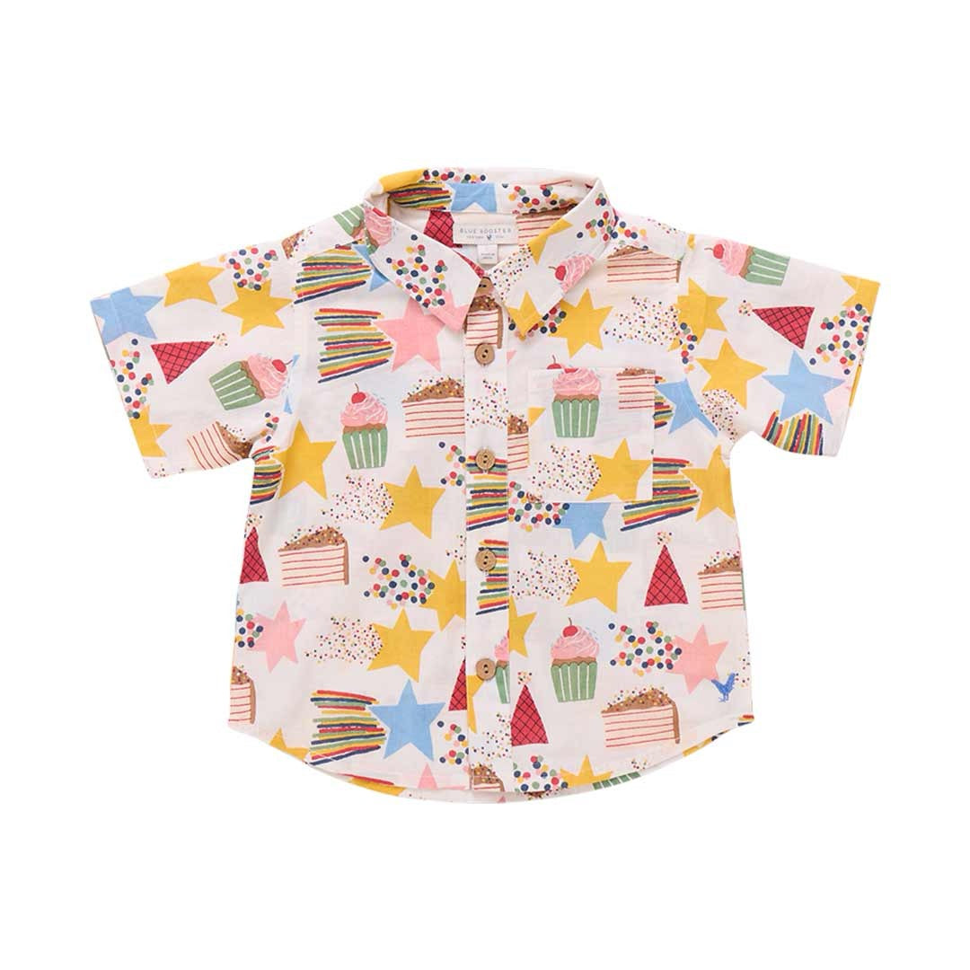 Cel-e-brate Good Times! Artist Charlotte Janvier pulls out all the stops in her fabulously festive Birthday Star print shown here on our classic Baby Boys Jack Shirt. Shooting stars, mile high cupcakes, party hats and slices of zillion layer cake burst off an ecru ground on this flock favorite shape. Short sleeves, a pattern on pattern chest pocket and wooden buttons up the front define this collared shirt. A perfect choice for highlighting the birthday boy on his special day! /p>