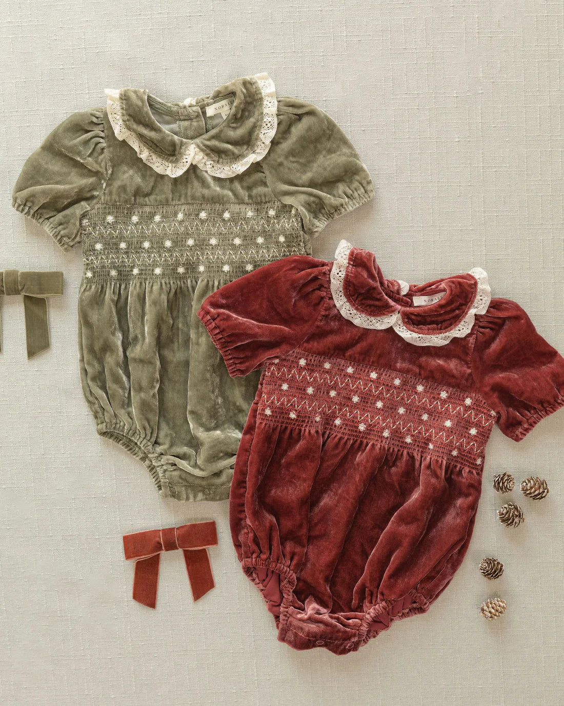 Regular price $72.00The Elizabeth Romper features a smocked bodice with dainty embroidered details, puff sleeves with lace trim, and a scalloped lace Peter Pan collar. Crafted in soft velvet, this timeless silhouette evokes a sense of tradition and nostalgia, making it the perfect keepsake dress for special occasions and holiday gatherings.