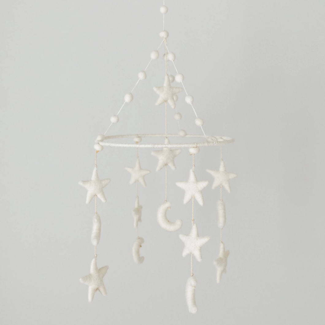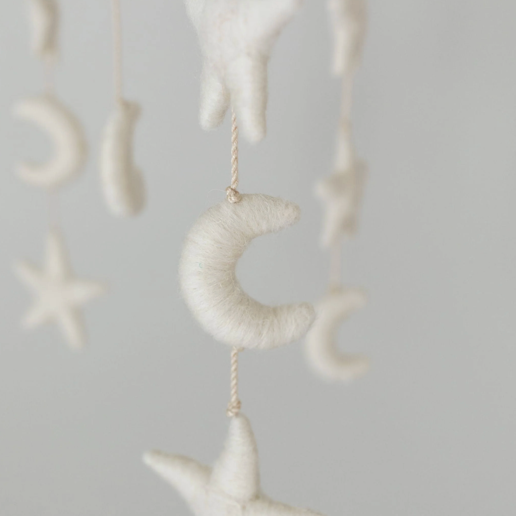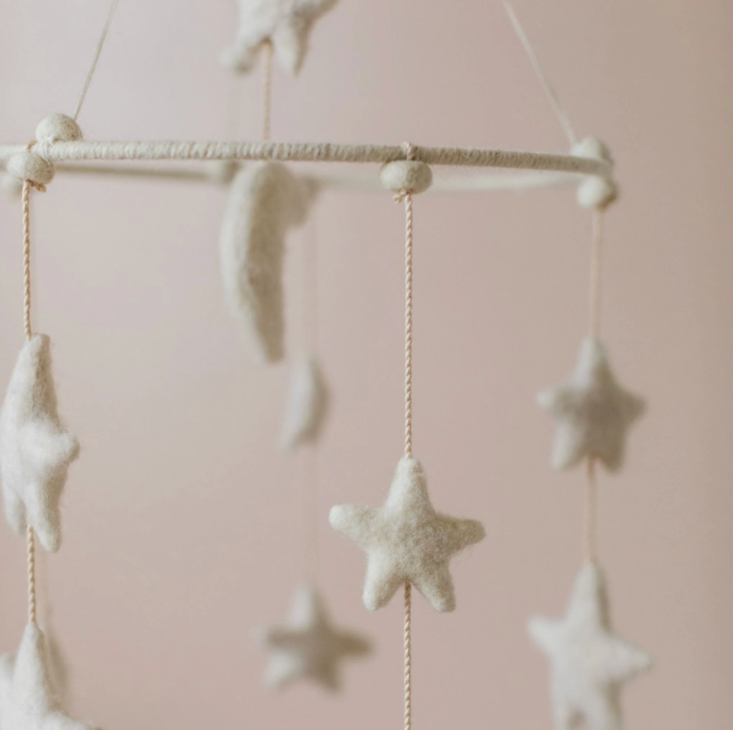 Watch your little one's eyes light up as this whimsical wool mobile dances gently overhead. Crafted with intention and ethical care, each Stargazer mobile is a singular treasure - no two are exactly alike. Perfect for sparking wonder and adding a dash of personality to baby's cozy corner.