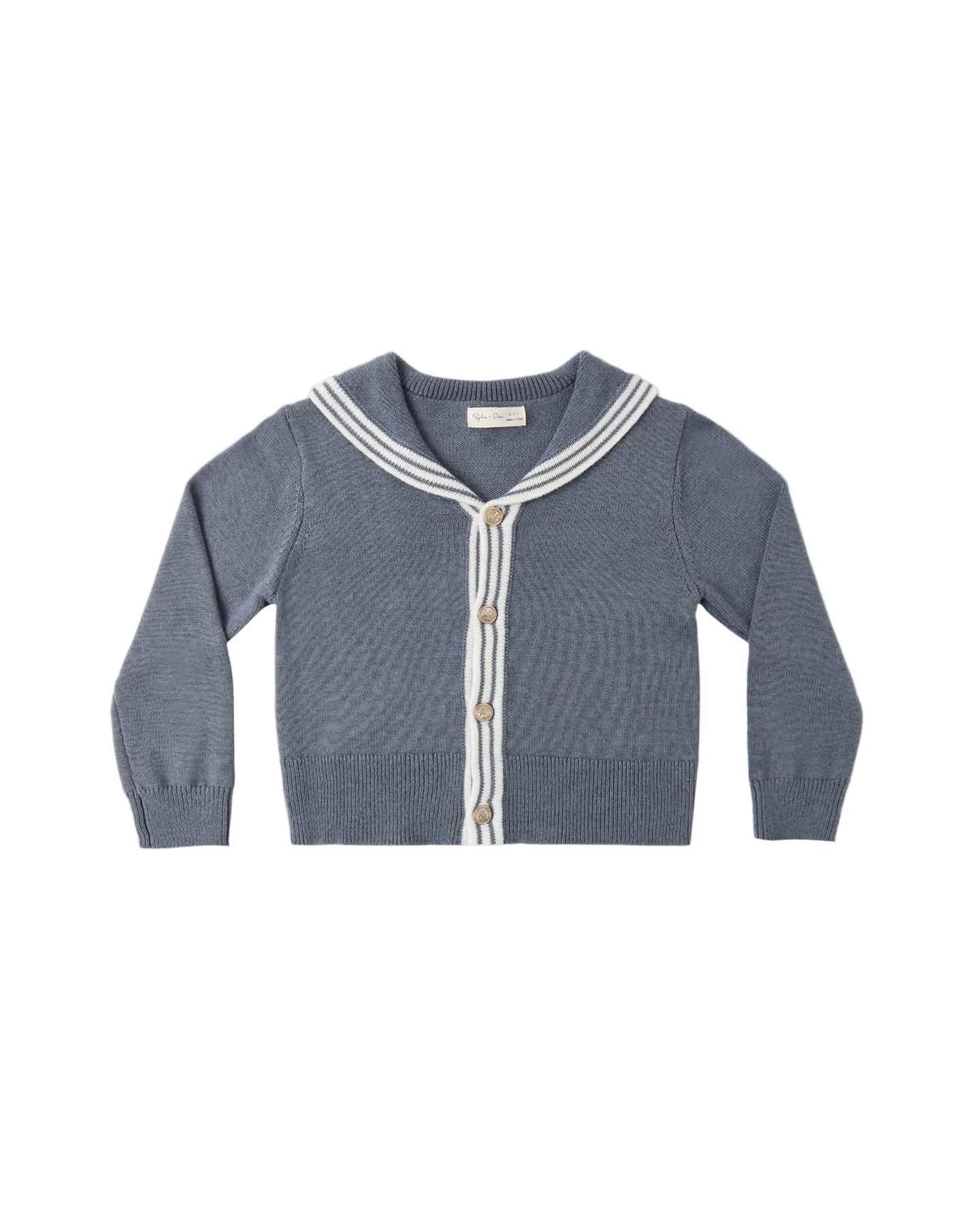 Rylee + Cru Blue knit sailor cardigan with white trim on a white background