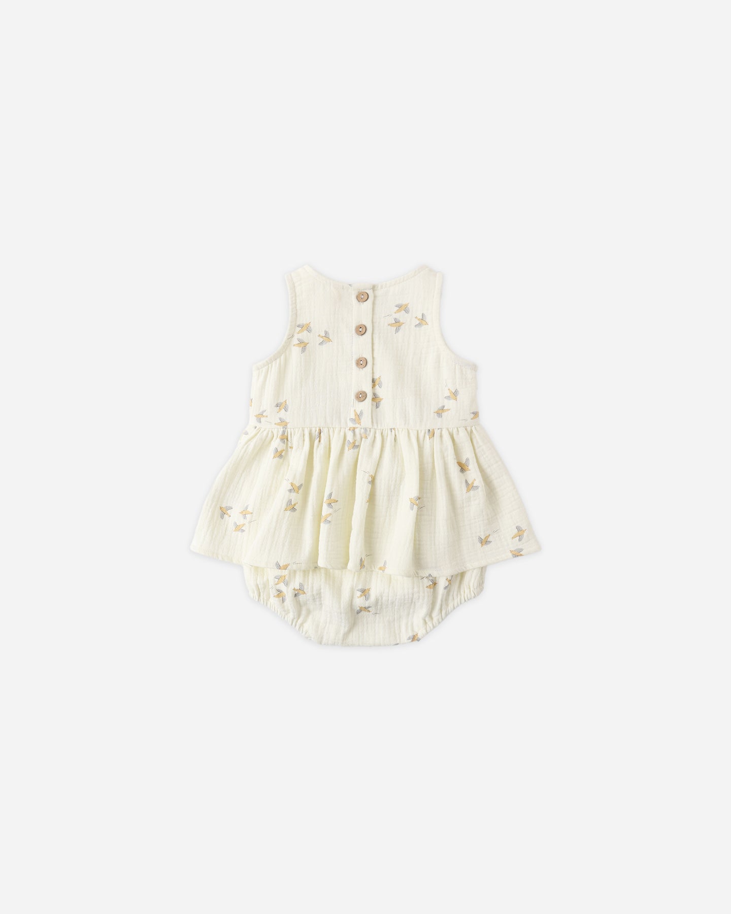 Skirted tank one-piece in a organic cotton gauze fabric, with a button back closure and snaps at the bottom for easy changes.