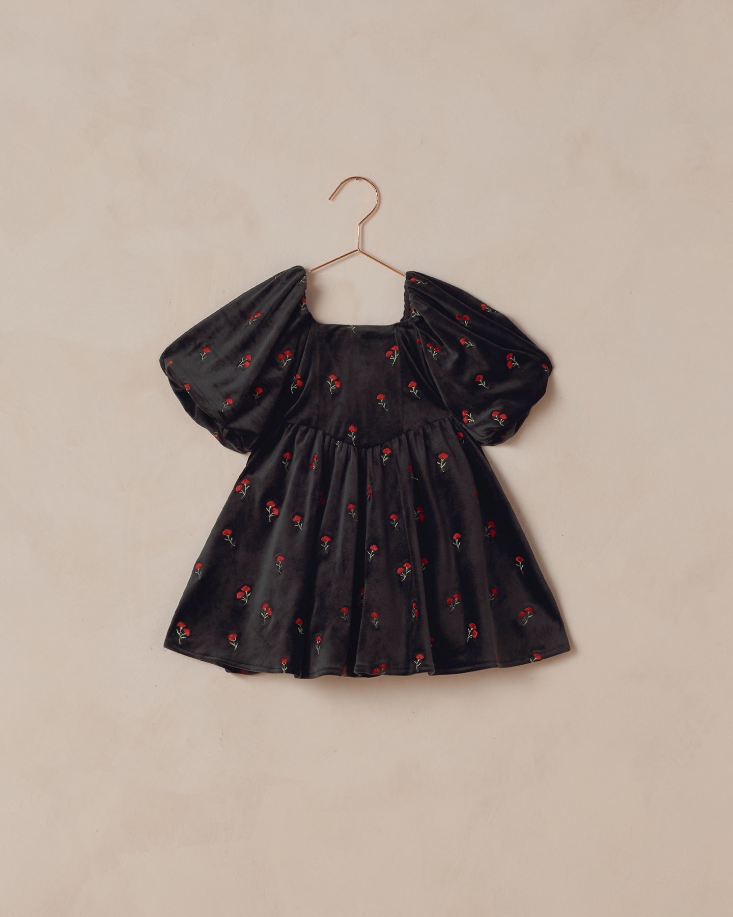 Featuring a ‘velvet floral’ print on a ‘black’ hue. These red embroidered flowers are sure to be a statement at any holiday gathering this winter.